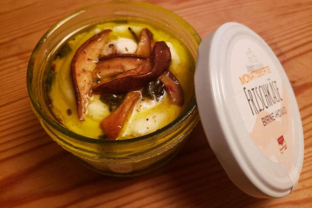 Frischkäsezubereitung mit Olivenöl, Birne und Honig